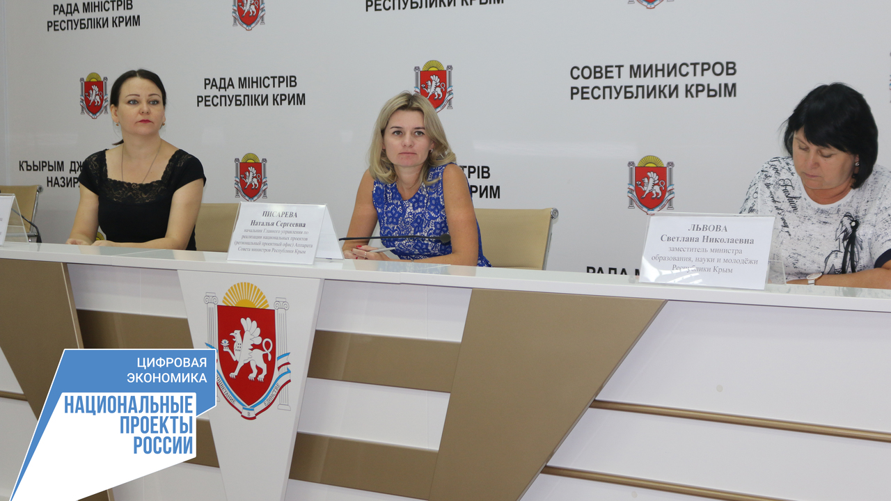 Начальник Главного управления по реализации национальных проектов (региональный проектный офис) Аппарата Совета министров Республики Крым Наталья Писарева совместно с заместителем министра образования, науки и молодёжи Республики Крым Светланой Львовой и первым заместителем министра внутренней политики, информации и связи Республики Крым Олесей Силантьевой провели оперативное совещание по вопросам обучения кадров для достижения целевых показателей регионального проекта «Кадры для цифровой экономики» в 2020 году.